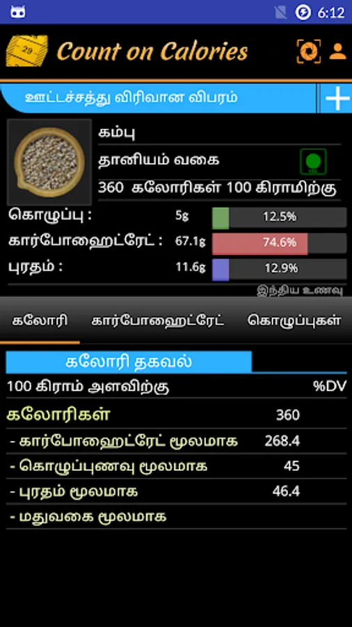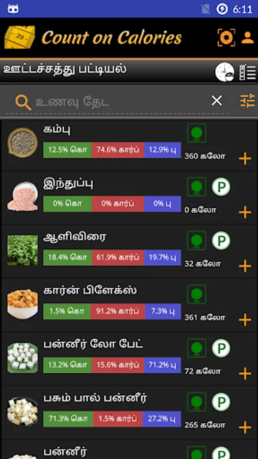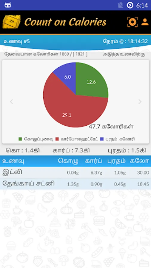 * Displays Food Items' Macro-Nutrients values - Carbohydrates, Proteins and Fats.