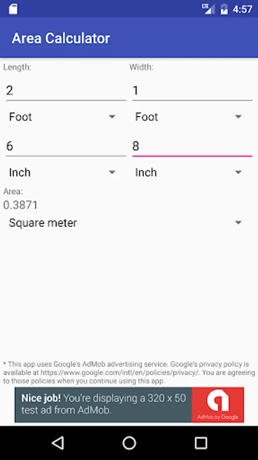 Length and width can be entered in two different units such as foot and inch or even meter and inch if you will. The resulting area may also be in any unit system.