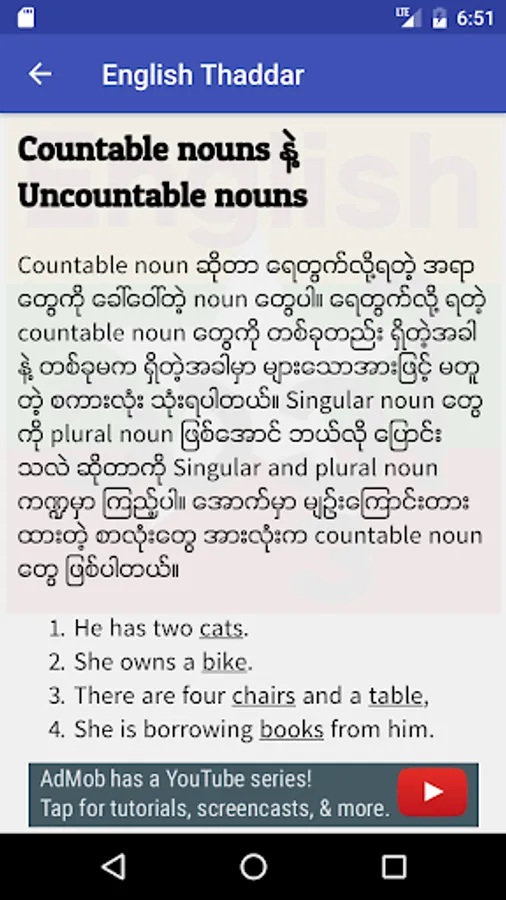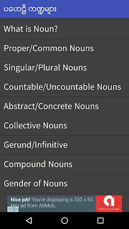 In this app, one can learn English grammar and practice the knowledge using the quizzes provided. By practicing the quizzes, you can be more familiar with the theories learned from the lecture pages. More lessons and quizzes would be added periodically.