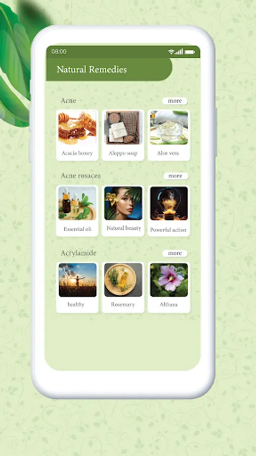 Some topics that you can find on the app Natural Remedies are information and application about Aloe Vera, how to prepare the Golden Milk, and also the green tee Matcha. You can read also the properties of turmeric, and find out the essential oils that you can use against anxiety or depression.
