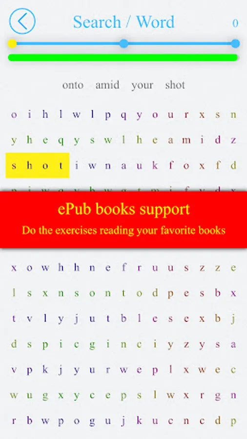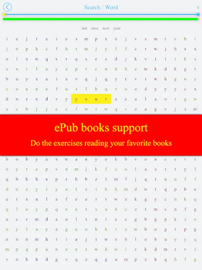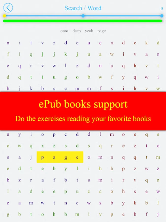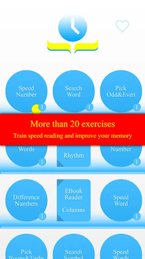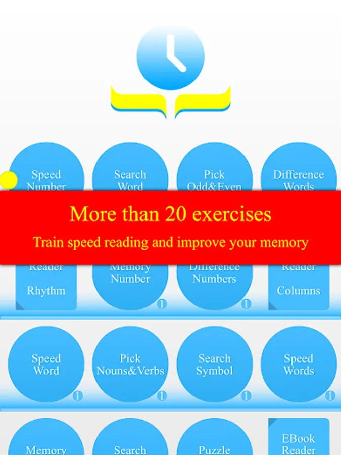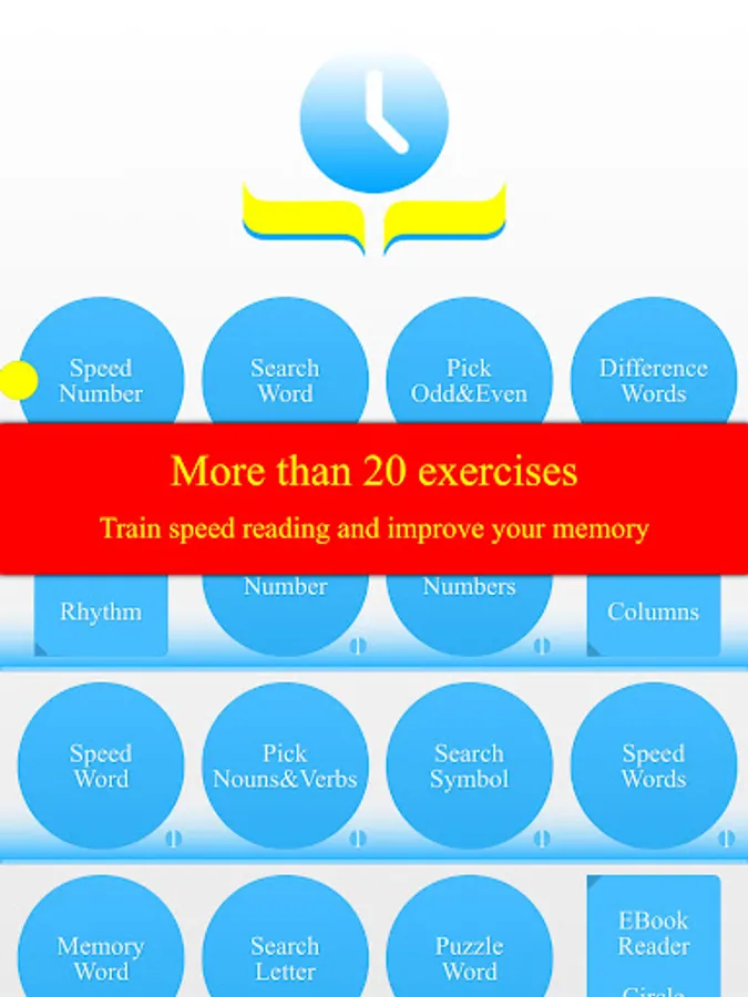 In this application, you can try both classic exercises for developing fast reading skills and unusual exercises for developing memorization skills. In addition, you can turn interesting books into speed reading exercises. To do this, download a book in fb2 or epub format to the application and do the exercises while reading the book.
