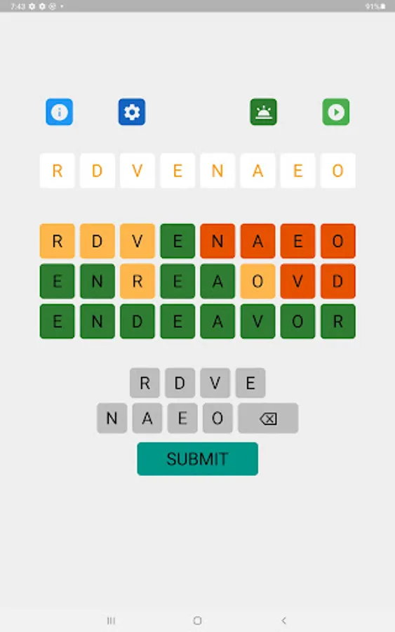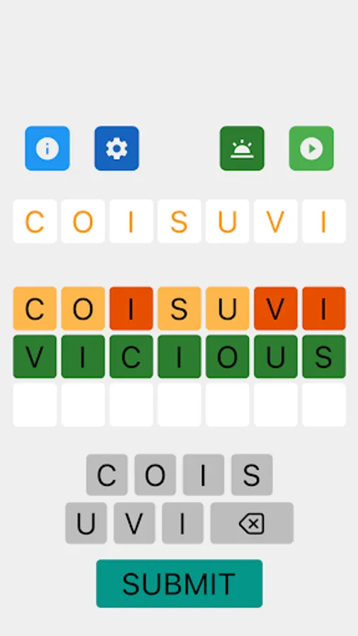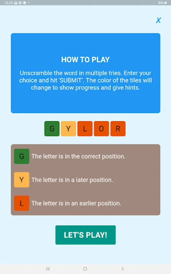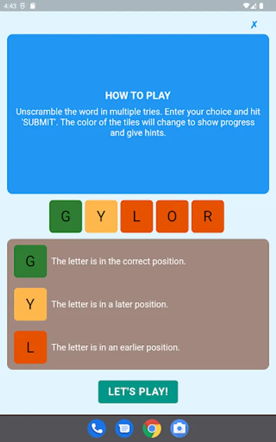Your task is to build words from the scrambled letters. You have 3 to 14 letter word choices. Unscramble letters progressively in tries. 2 tries for words of no more than 6 letters, 3 tries for words of 7 to 12 letters, and 4 tries for words of 13 and 14 letters. After each try, the color of the letters will change to show progress and give hints. The patterns in the word unfold as the game progresses, enabling players to find even very long words in a few tries.