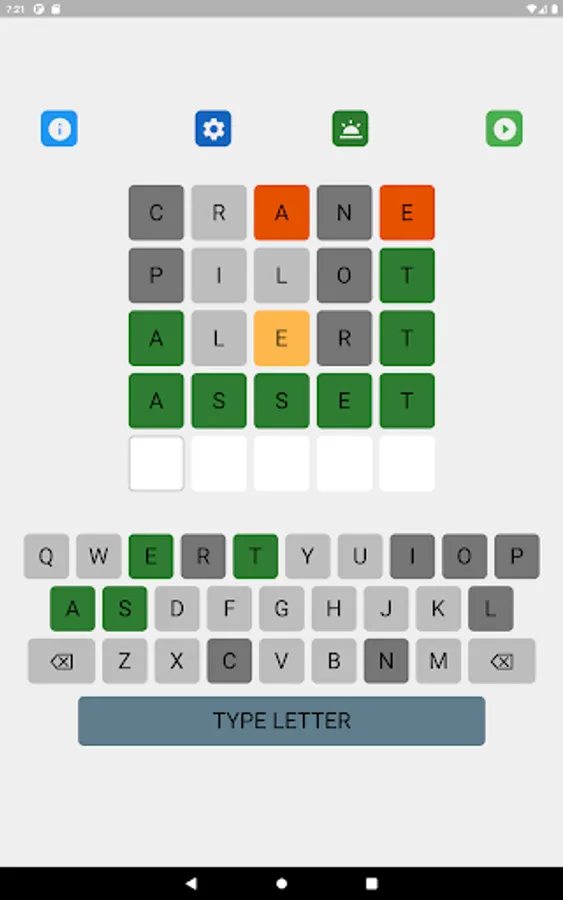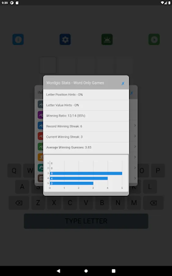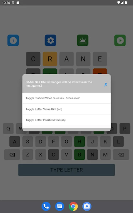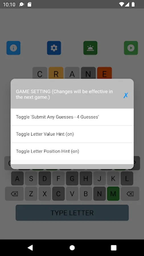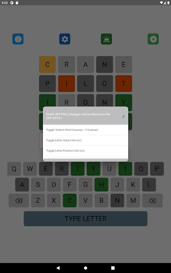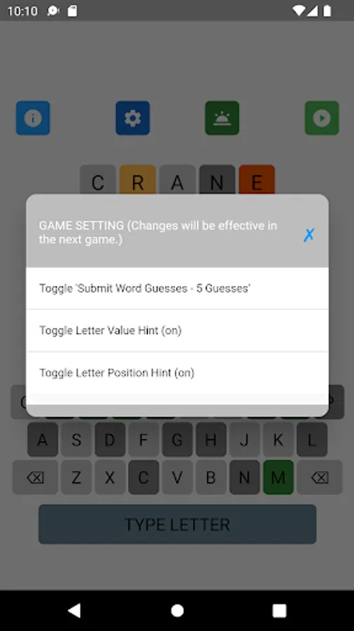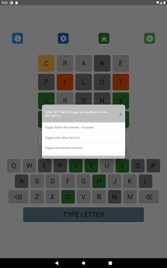 The letter position and letter value hints may be toggled on and off in the game setting. The game supports 8 game types with different levels of hints. Different word search strategies are needed to achieve the best performance in different types of games. A player can select his favorite game type in the game setting.