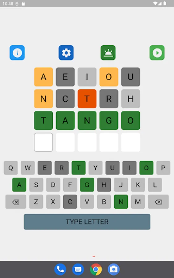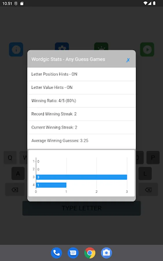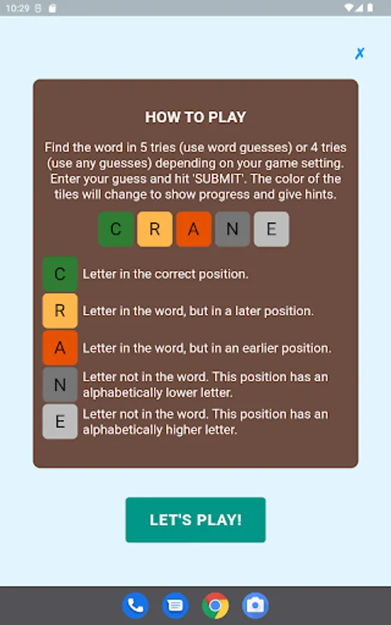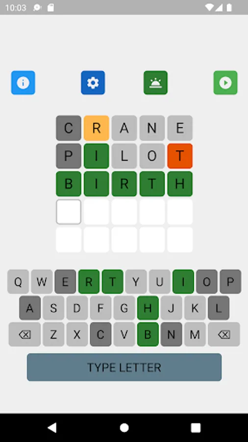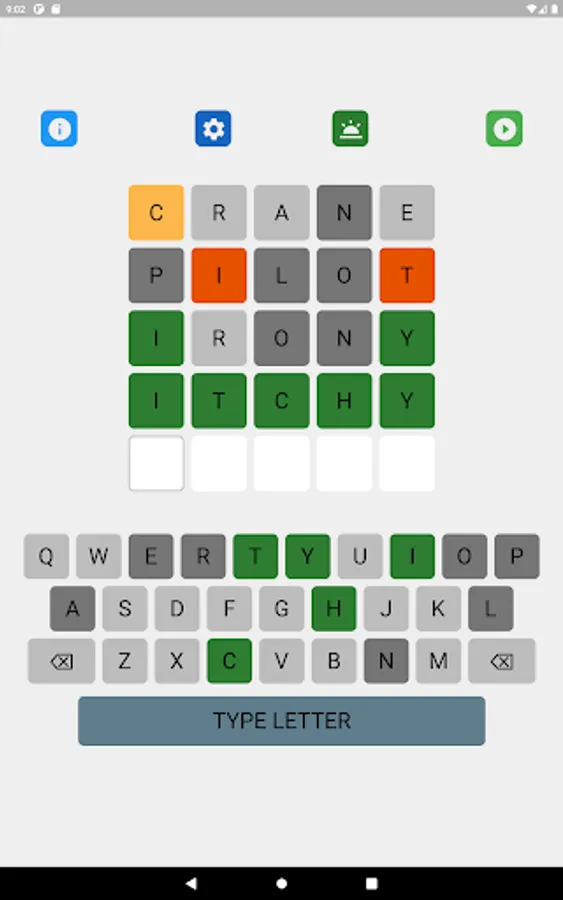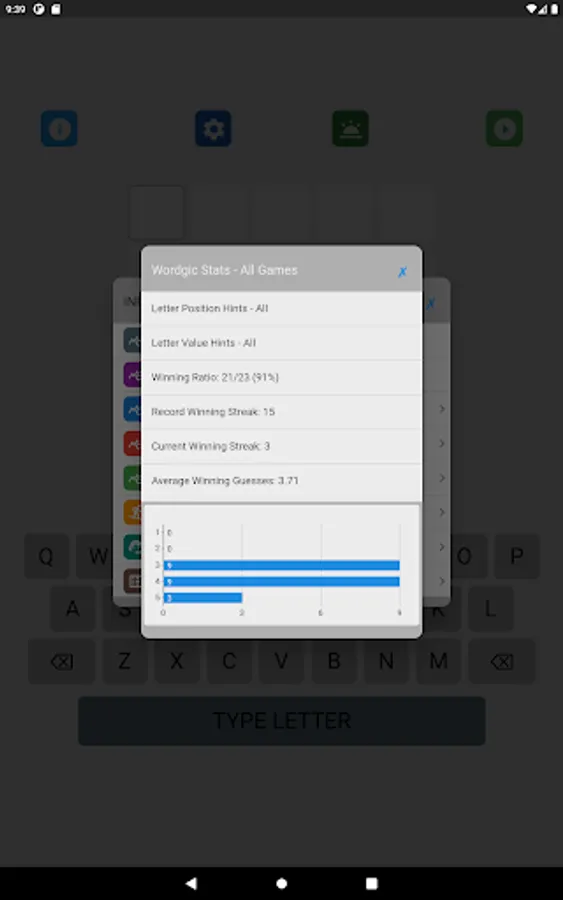 The letter position and letter value hints may be toggled on and off in the game setting. The game supports 8 game types with different levels of hints. Different word search strategies are needed to achieve the best performance in different types of games. A player can select his favorite game type in the game setting.