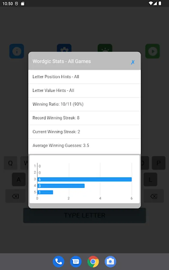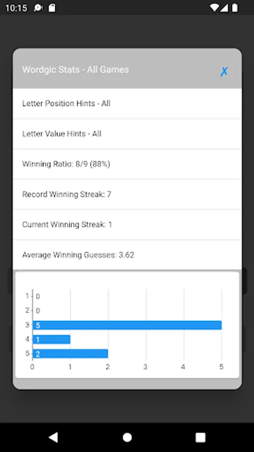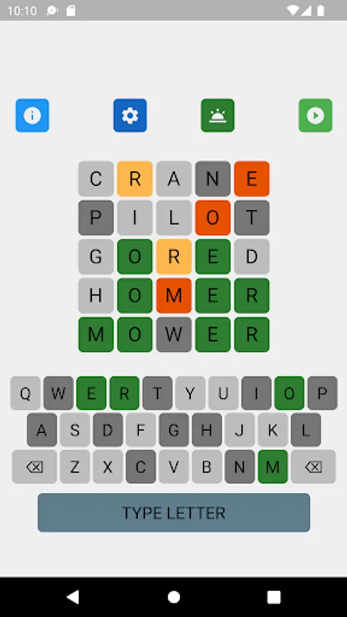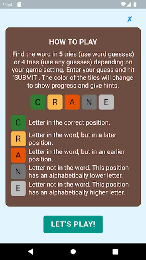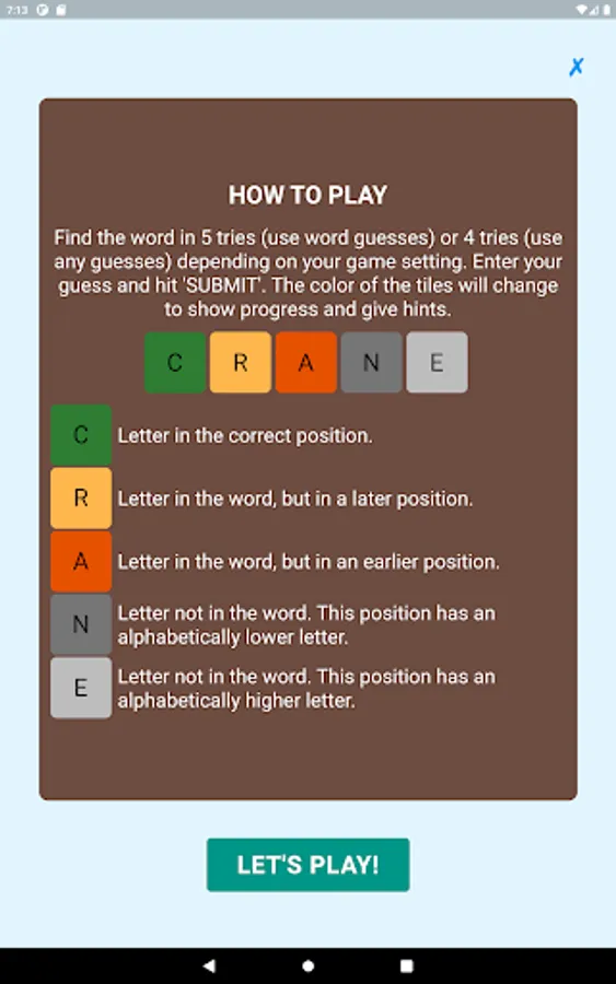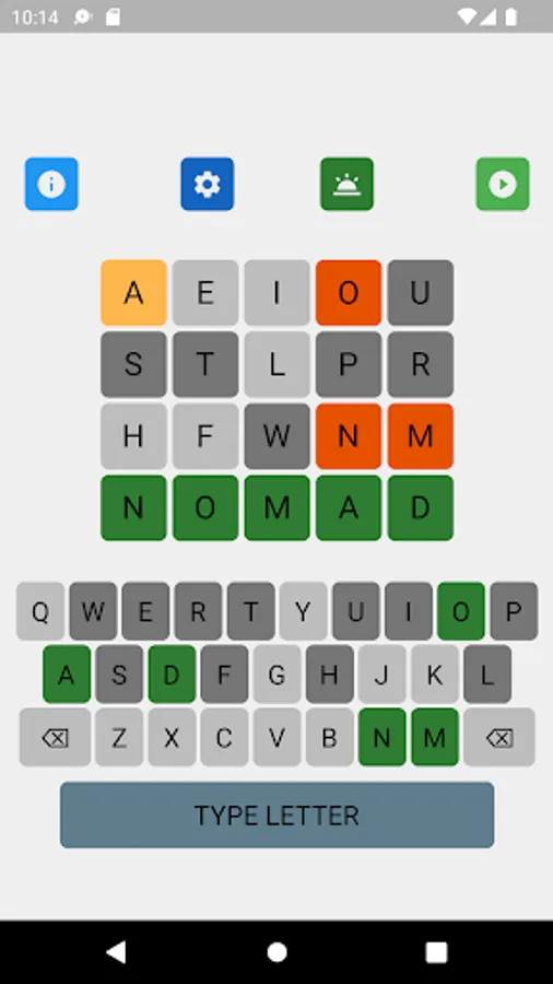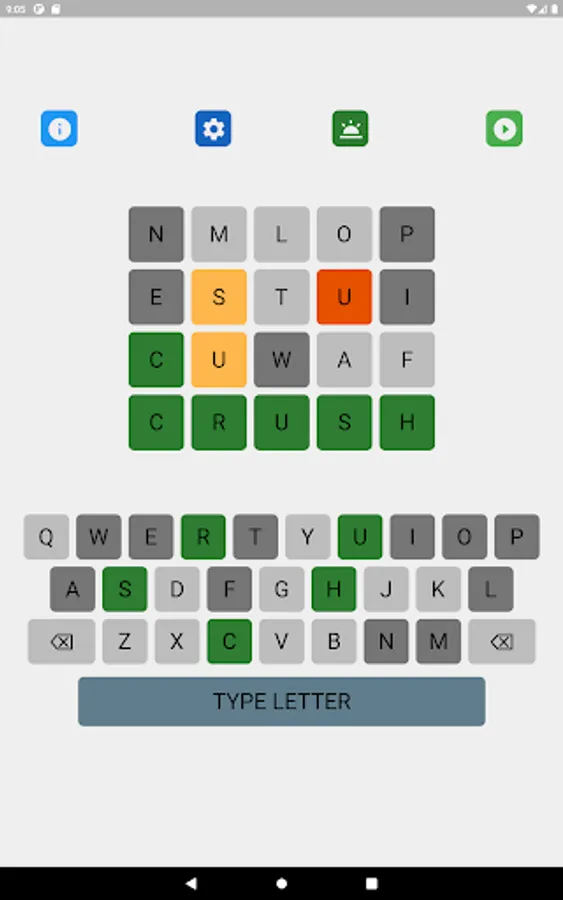 Wordgic is a word search, word guess game where players search for the word in five tries (when the guesses are restricted to words) or four tries (when there is no restriction on the guesses) depending on the game setting . After each try, the color of the letters will change to show progress and give hints: