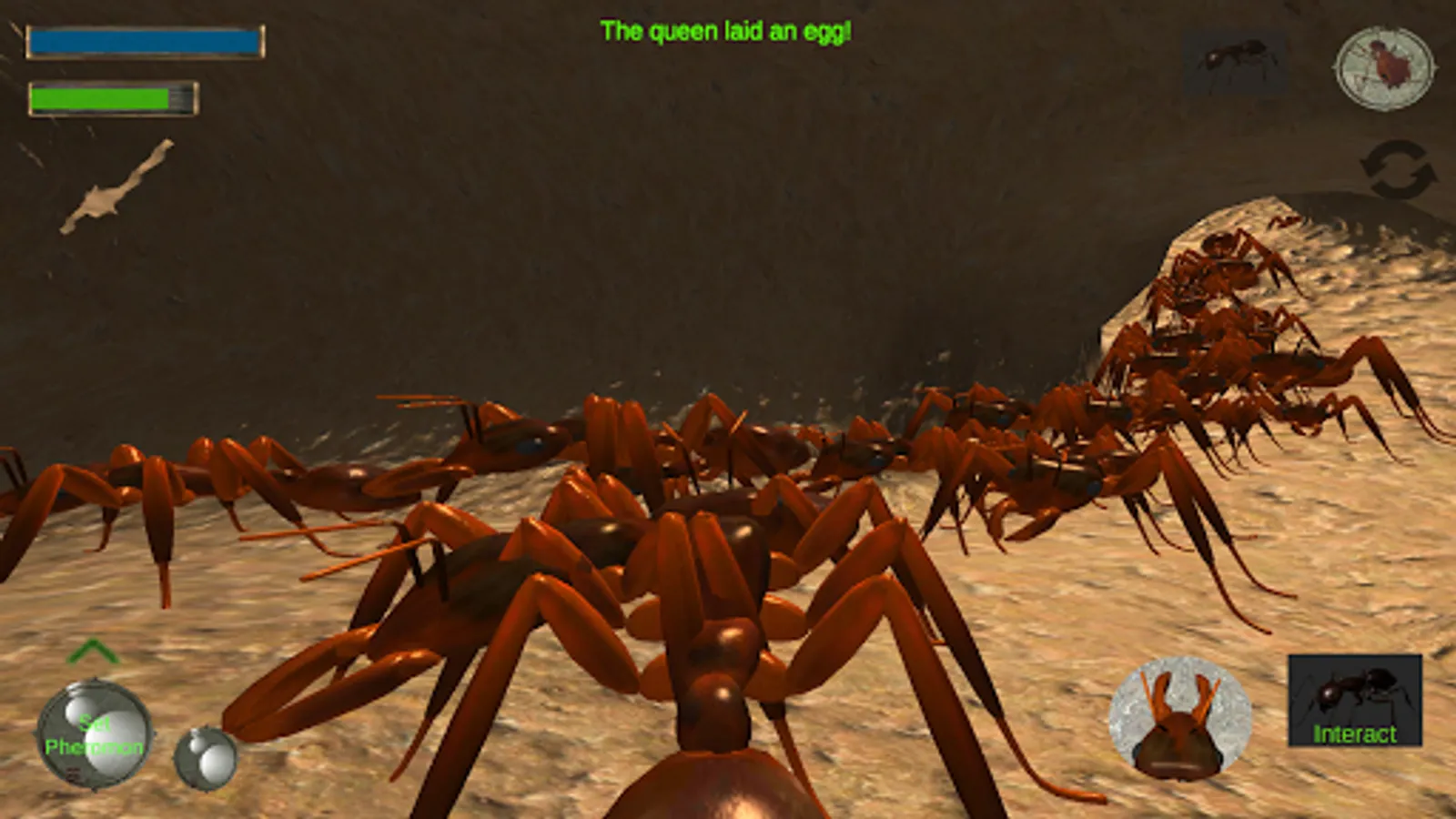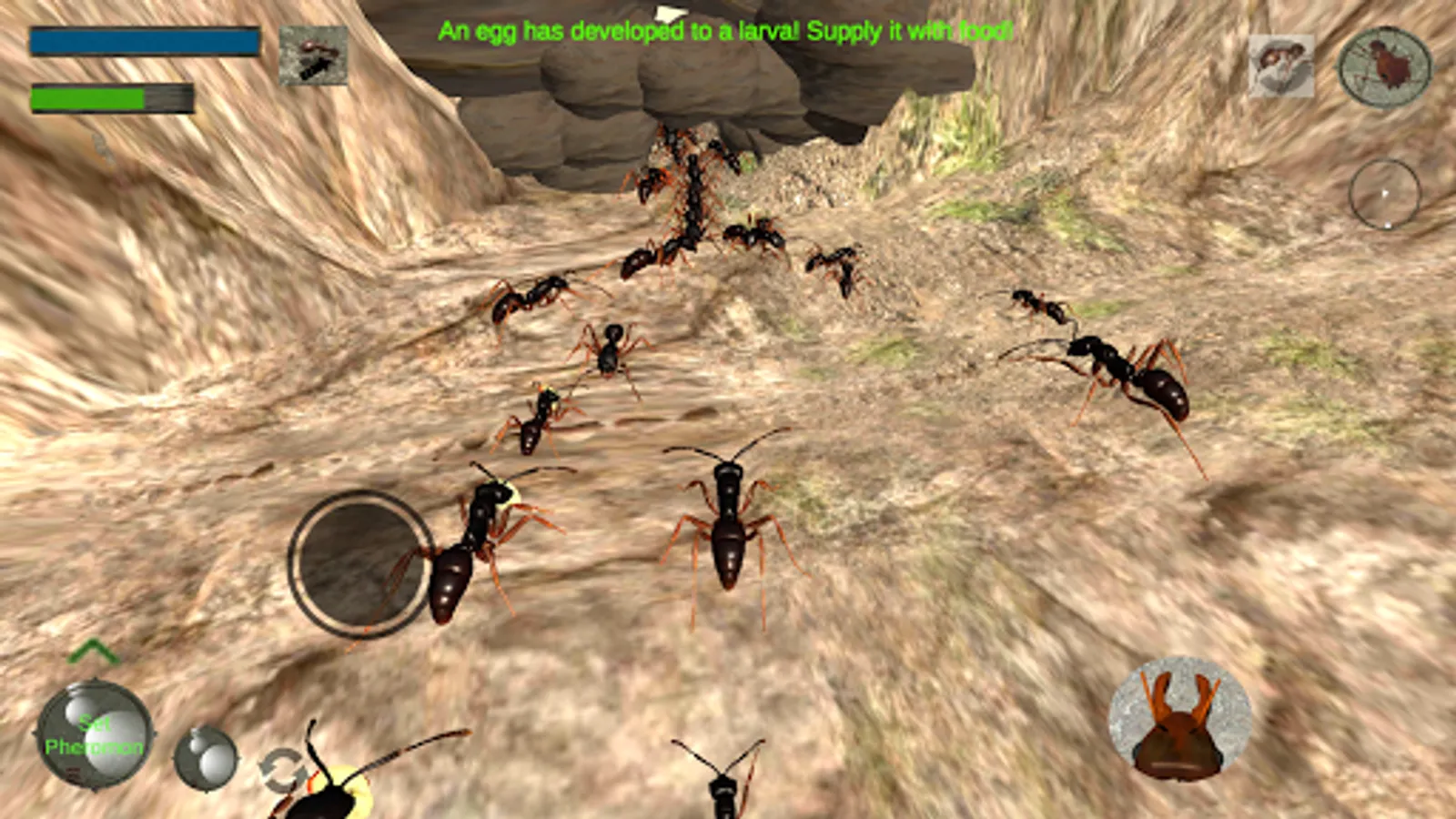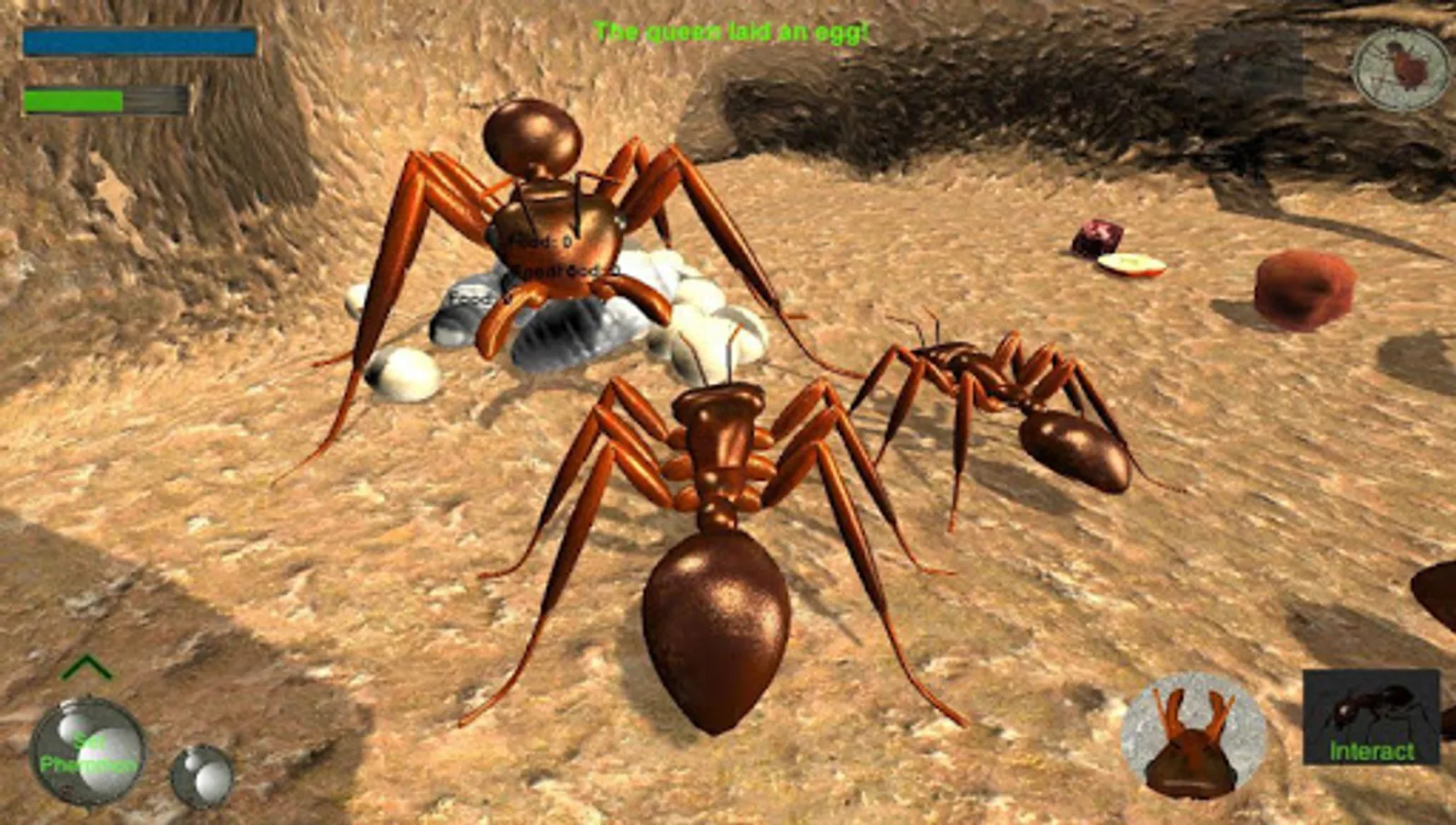Search for food resources in order to feed the ant queen and the larvae to let them pupate and transform into a new ant. You can create pheromone trails to attract other ants or just ask the ants directly to follow you.
