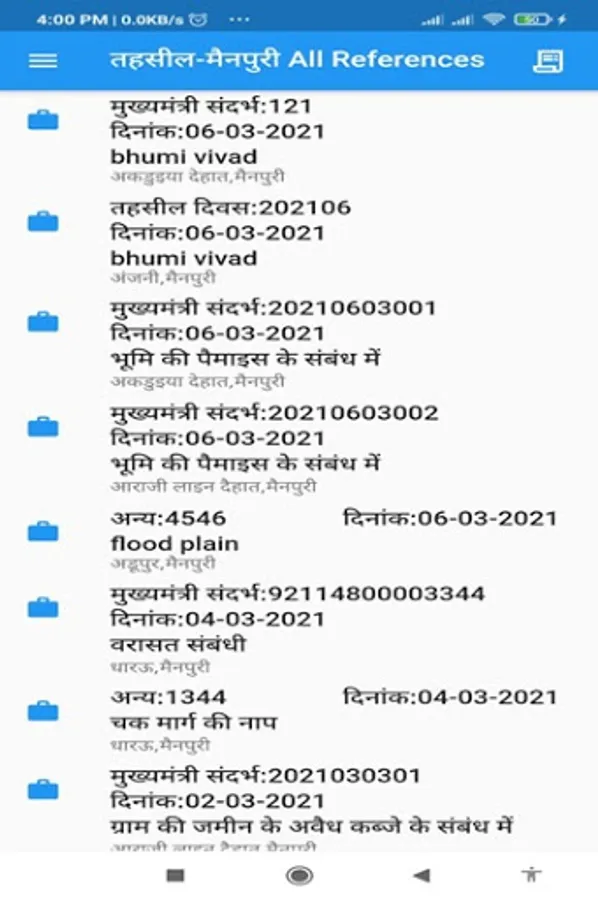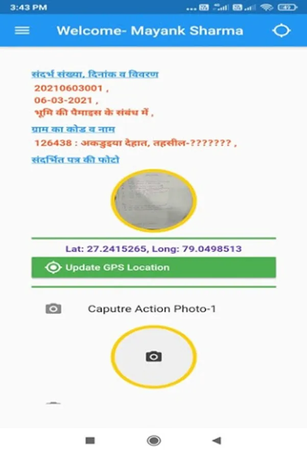from the applicant, from their login. The references are then marked to concerned lekhpal for field verification. The lekhpal then verifies the land and captures images with the parties involved on the disputed land with geo-tagging. The lekhpal then files his observations and submits the reference through his login on mobile app. Observations with images of actions