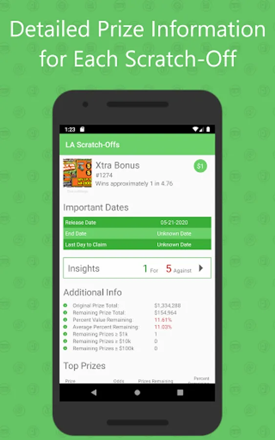 * Disclaimer 2: Whenever playing a lottery, please play responsibly. We by no means guarantee results with our app, that it will meet all of your expectations of functionality in an uninterrupted, timely, or error-free method with accurate results. Any errors in software will be corrected as soon as possible, but may occur. Any material, data, or insight gleaned from use of the LA Lottery Scratch-Off Guide is done at your discretion. We simply wish to give players the most information publicly available to them.