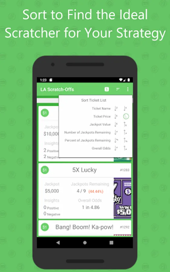 Let's say you only like to play $5 games. Apply a filter via the menu bar and you're only comparing the $5 scratch off tickets to eachother. From there, you might want to buy a ticket with the highest jackpot amount. Use the sort menu and purchase the first ticket in the list! Or you might notice that another $5 ticket with a slightly lower jackpot has considerably more jackpots out there waiting to be found - so maybe you choose that one instead. Formulate your strategy and the app will help you find whichever game is best for it!