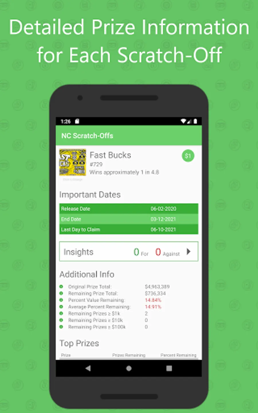* Disclaimer 2: Whenever playing a lottery, please play responsibly. We by no means guarantee results with our app, that it will meet all of your expectations of functionality in an uninterrupted, timely, or error-free method with accurate results. Any errors in software will be corrected as soon as possible, but may occur. Any material, data, or insight gleaned from use of the NC Lottery Scratch-Off Guide is done at your discretion. We simply wish to give players the most information publicly available to them.