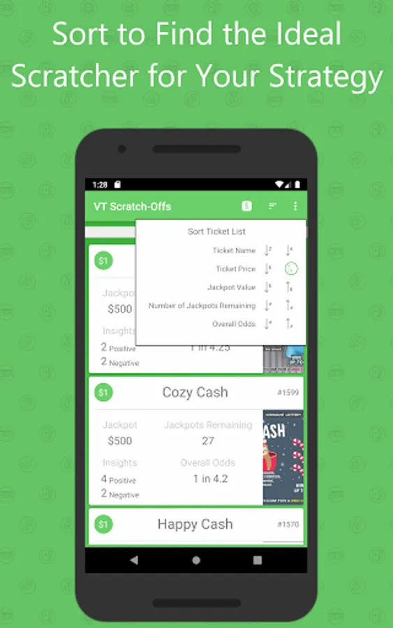 Let's say you only like to play $5 games. Apply a filter via the menu bar and you're only comparing the $5 scratch off tickets to eachother. From there, you might want to buy a ticket with the highest jackpot amount. Use the sort menu and purchase the first ticket in the list! Or you might notice that another $5 ticket with a slightly lower jackpot has considerably more jackpots out there waiting to be found - so maybe you choose that one instead. Formulate your strategy and the app will help you find whichever game is best for it!