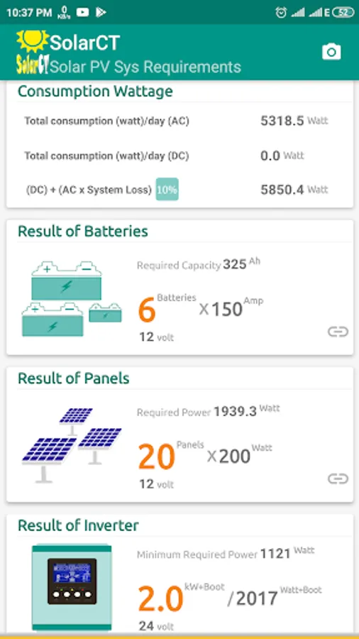 SolarCT is an app calculator for requirements of solar system components like number of required solar panels and batteries, size of inverter/UPS and controller charger, and how to connect solar panels and batteries in series and parallel depending on system/inverter voltage.