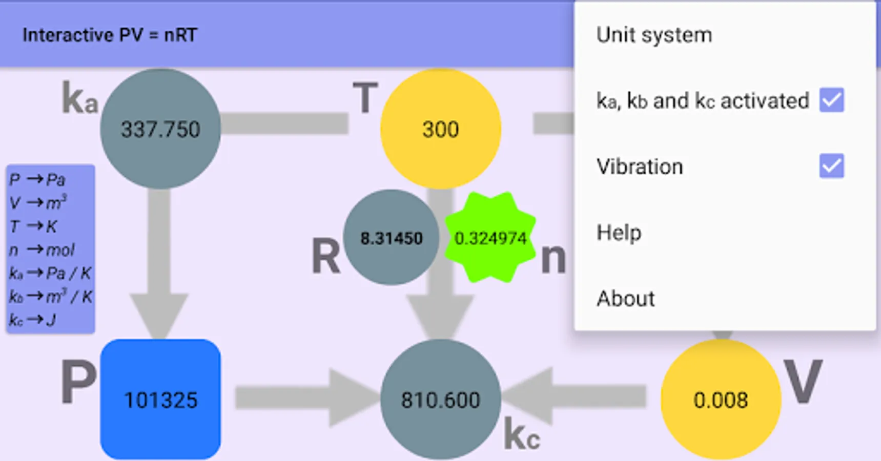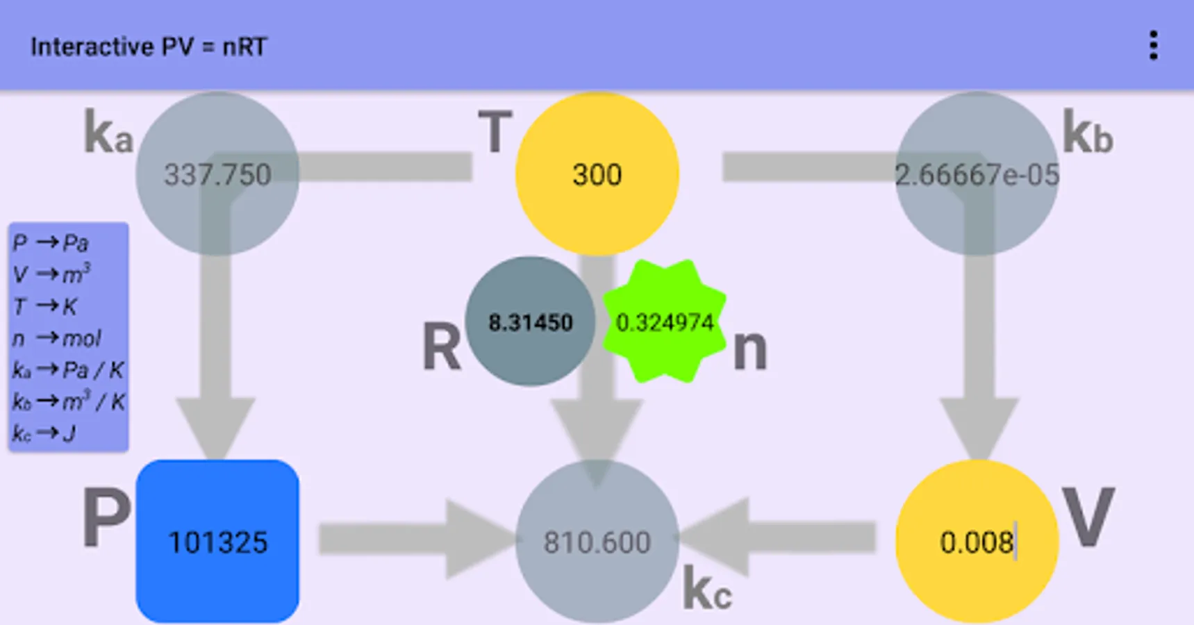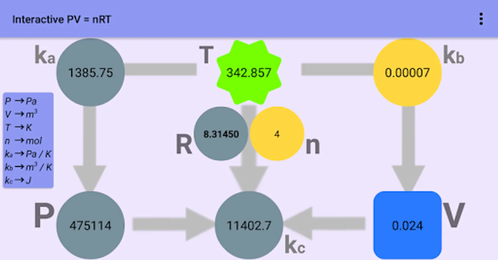 - As you probably will work only with the PV = nRT equation, variables ka, kb and kc are disabled by default so that they do not disturb. However, you still can enable them if you want to.