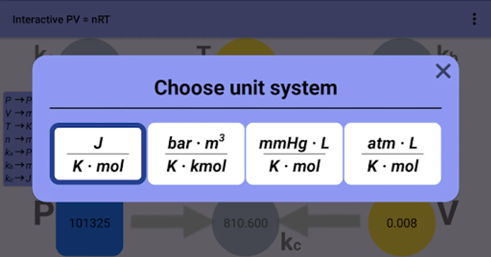 - You can also change the units system of the equation. Although the unit system configured by default is the International System of Units, you can choose among three more options: mmHg·L/(K·mol), bar·m3/(K·mol) y atm·L/(K·mol).