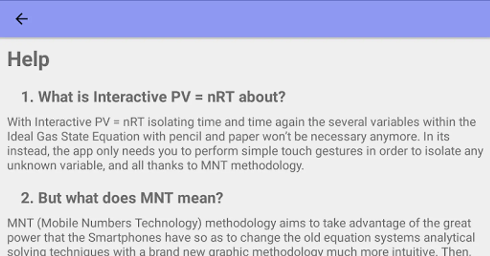 With Interactive PV = nRT isolating time and time again the several variables within the Equation of State for Ideal Gases with pencil and paper won’t be necessary anymore. In its instead, the app only needs you to perform simple touch gestures in order to isolate any unknown variable, and all thanks to MNT methodology.
