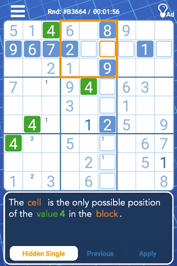 In Sudoku S. , there is an advanced hint system. It teaches you solve sudoku step by step using popular sudoku techniques: Hidden Single, Naked Single, Hidden Pair, Naked Pair, Pointing, Claiming, X wing, Swordfish, etc.