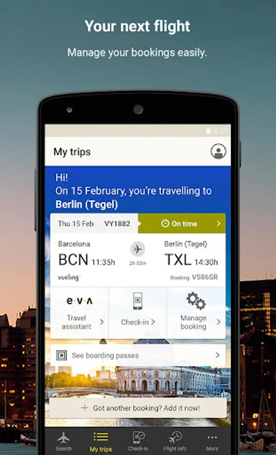 Manage all your bookings easily. Add bags, choose your seat on the plane, change your flight, bring your flight forward... Everything you need at your fingertips.