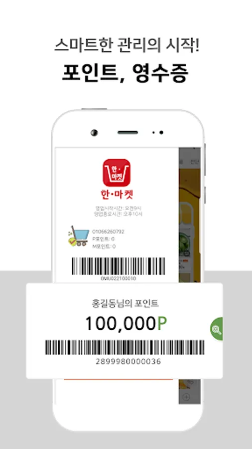 - 한마켓 화서점의 포인트 카드를 모바일로 편리하게 이용하시고, 언제 어디서든 포인트를 확인하실 수 있습니다.