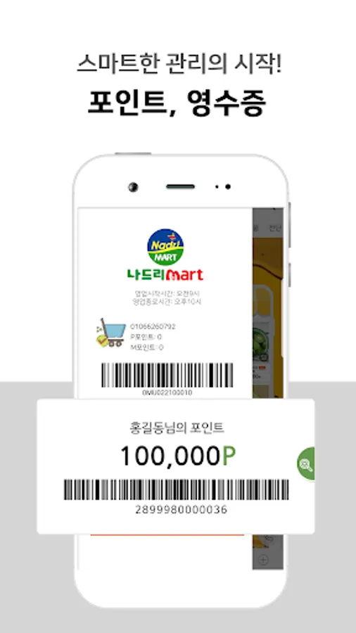 - 나드리마트의 포인트 카드를 모바일로 편리하게 이용하시고, 언제 어디서든 포인트를 확인하실 수 있습니다.