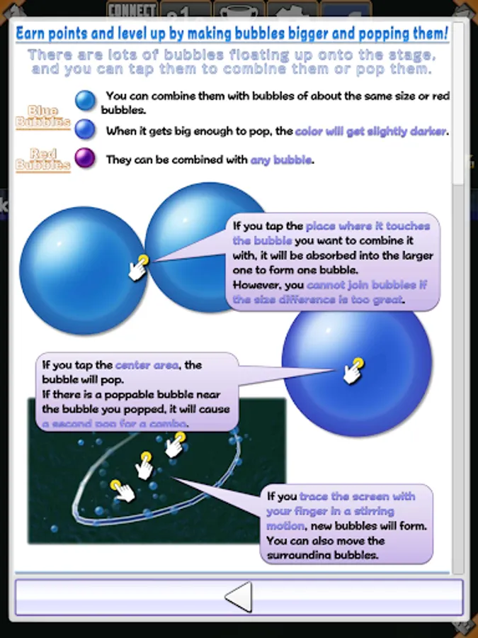 Popped bubbles create ripples that will pop any other bubbles in range, one after another. In this way, a lot of bubbles can be popped in succession, creating a popping chain reaction and accumulating a massive amount of points.