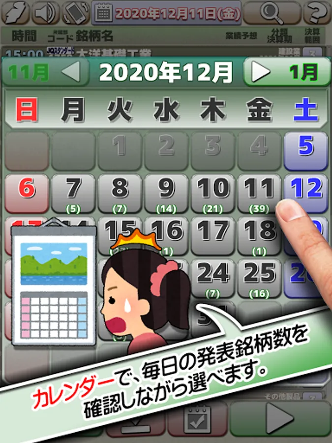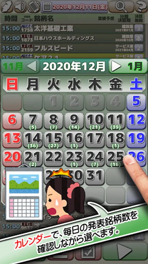 ・ You can list the stocks whose financial results will be announced on the desired date from the calendar.