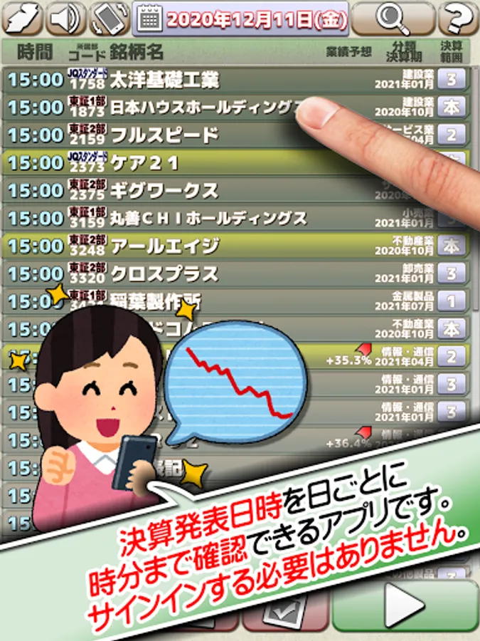 It is an application that allows you to check the scheduled date and time of the announcement of financial results of listed companies from the date to the time.