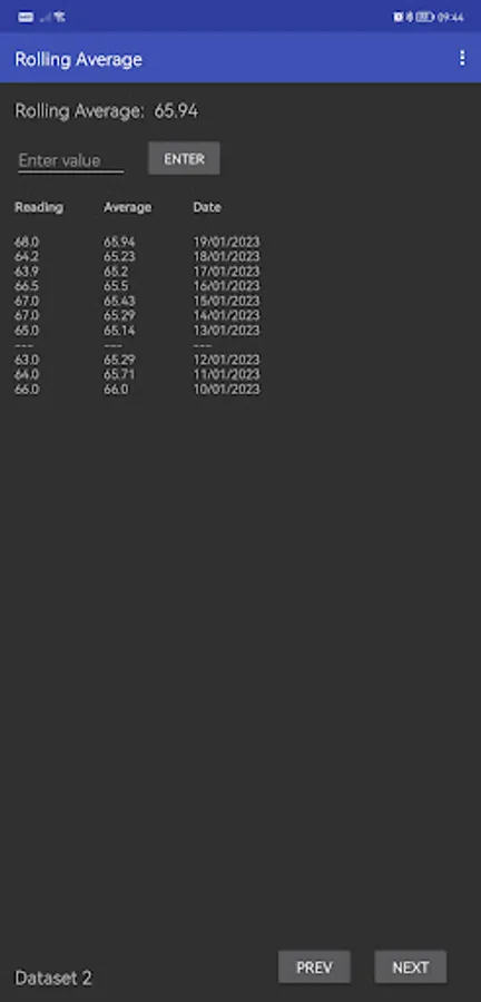 This is my first ever Android app and it's free with no ads, so please be kind if you choose to leave a review. Thanks for your understanding. If you want to improve it yourself or use the code for your own project, you're welcome. You'll find the code here: https://github.com/moandal/rolling-average