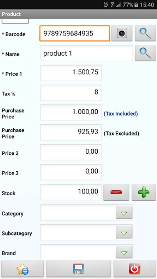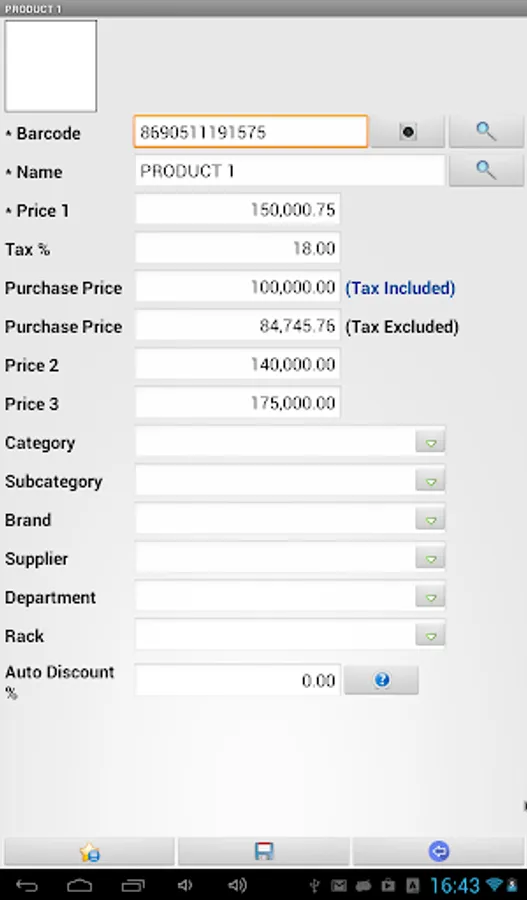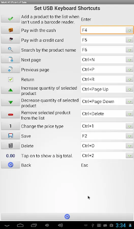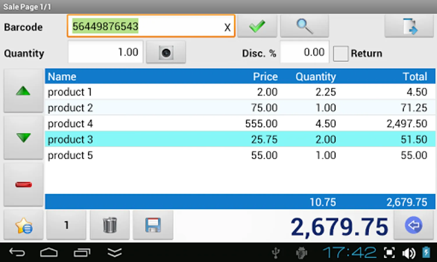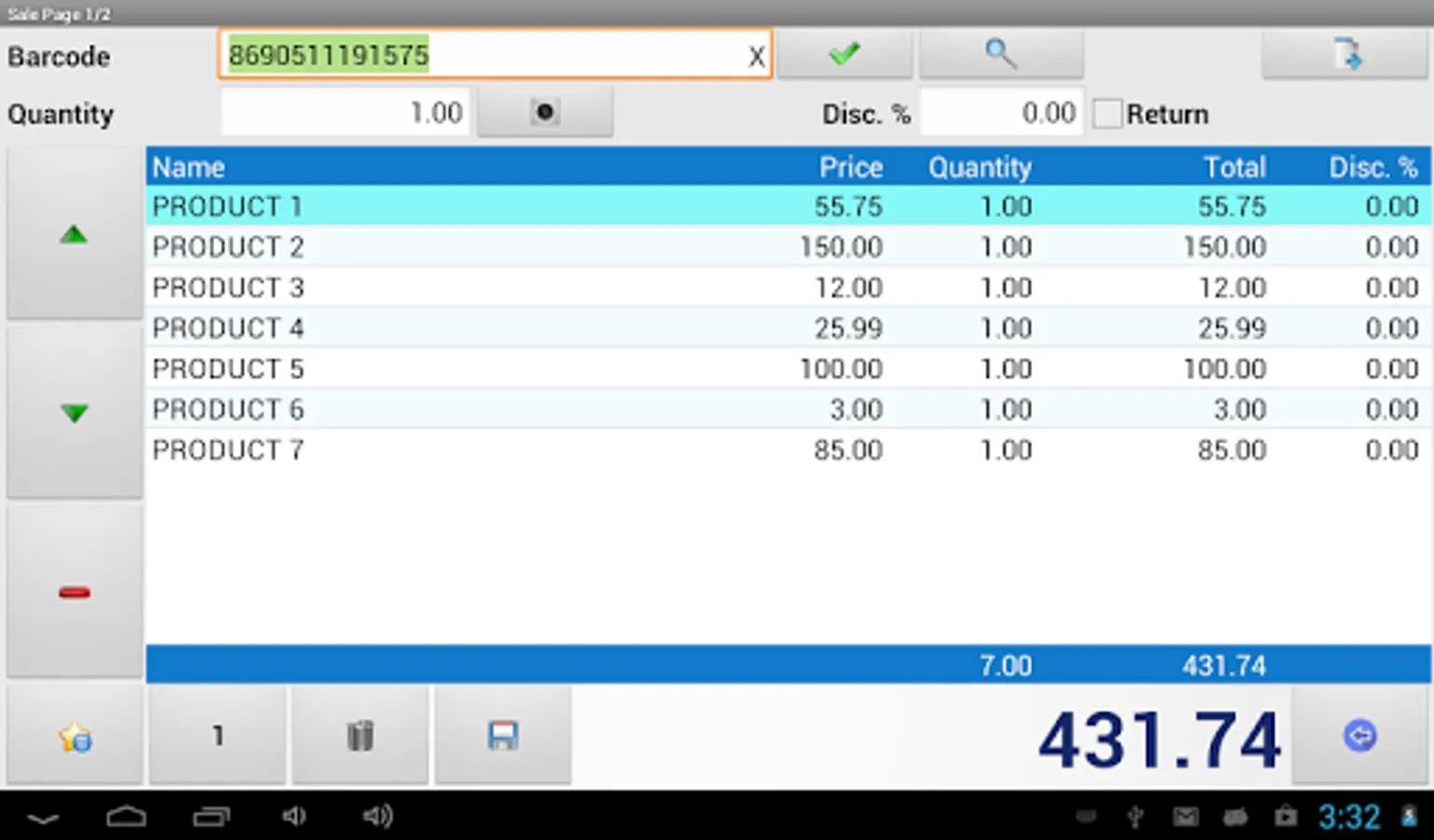 ●Display photo, name and price of the product largely on the screen by the help of "show price" section as the barcode of the product is read by device camera or by an external barcode reader or chose the product from the list.