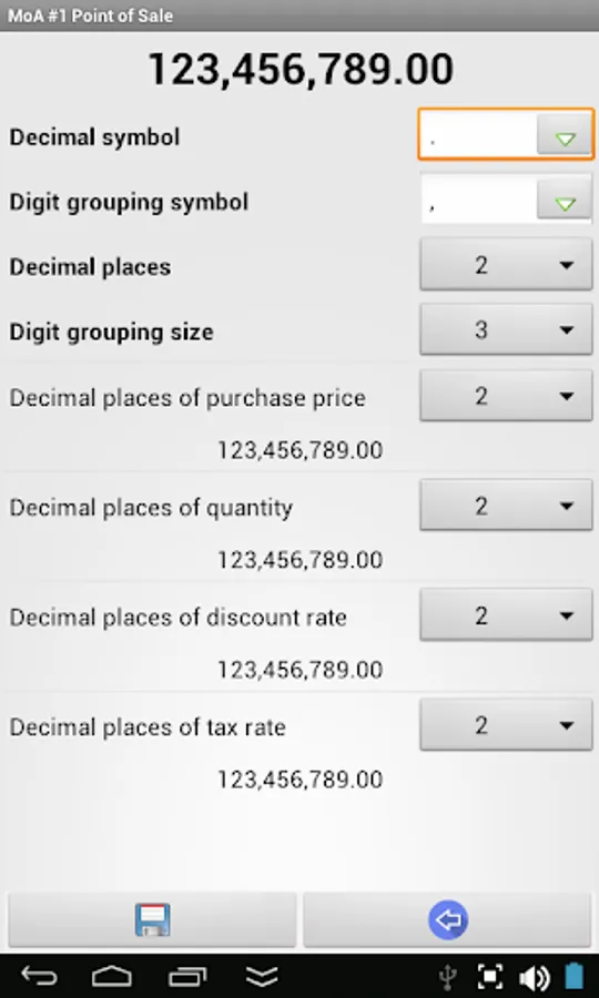●Set decimal places and customize decimal symbol, digit grouping symbol and digit grouping size settings. According to the settings you have done the numbers are formatted as they are input and displayed.