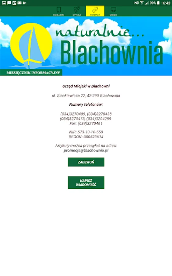 Information Bulletin Naturally Blachownia is a monthly published by the Municipal Office in Blachownia. Blachownia is a city in Poland, in the province of Silesia, in the Częstochowa poviat, the seat of the municipal-rural commune Blachownia. The city is located in Lower Upper Warta, on the Stradomka River. Historically, it lies in the Małopolska region [3]. It borders with a large forest complex, which includes in the Forests of Upper Liswarta Landscape Park. According to data from January 1, 2010, the city area was 36.66 km²