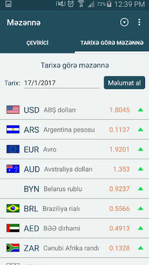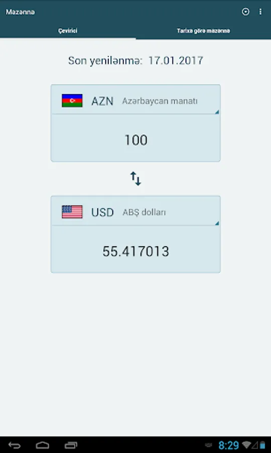 Məzənnə proqramından istifadə edərək cari tarixin məzənnəsinə görə müxtəlif ölkə pul vahidlərinin və qiymətli mettalların bir-birinə nəzərən qiymətini hesablaya bilərsiniz.