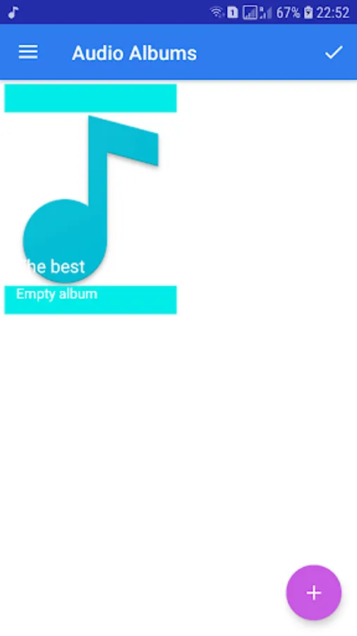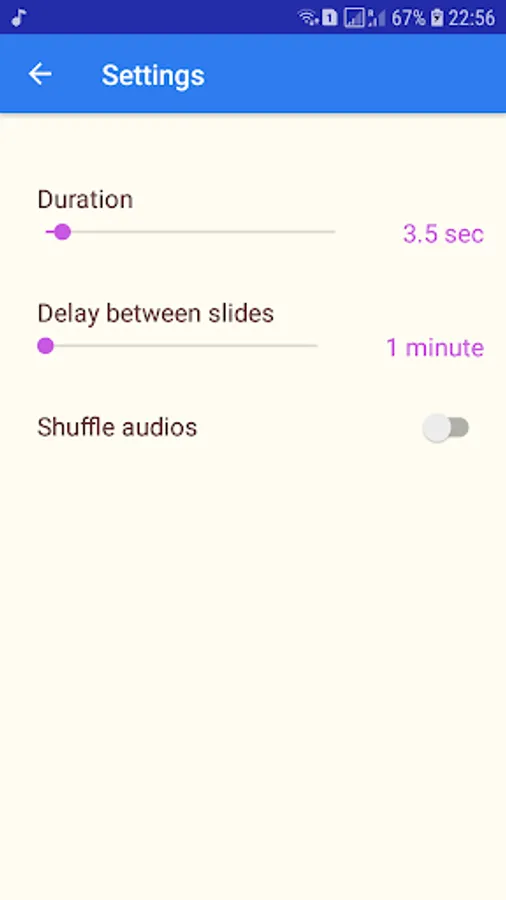For start create a new album, add there your favorite audios and tap Play button. Even after you leave the app you will listen your Happy Audios every couple of minutes during short time like a splash of good mood. Audios appear on the screen even though after leaving the app and you can set duration and period of playing selected audios.