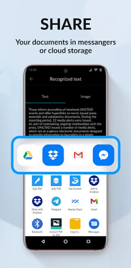 SHARE. Easily share documents with others via social media, messengers or email attachments. Upload scans to cloud services like Dropbox or Google Drive or simply print it via any WI-FI printer.