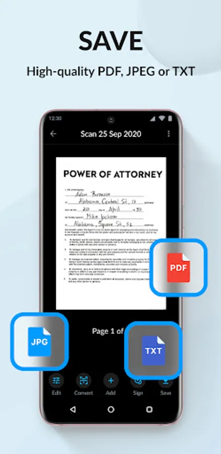 SAVE. You can save documents in high quality as PDF, JPEG or DOC.