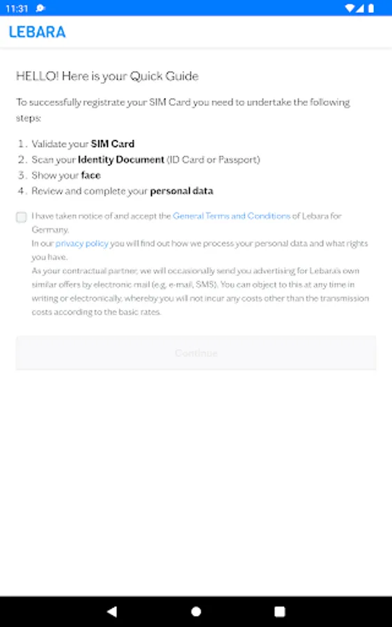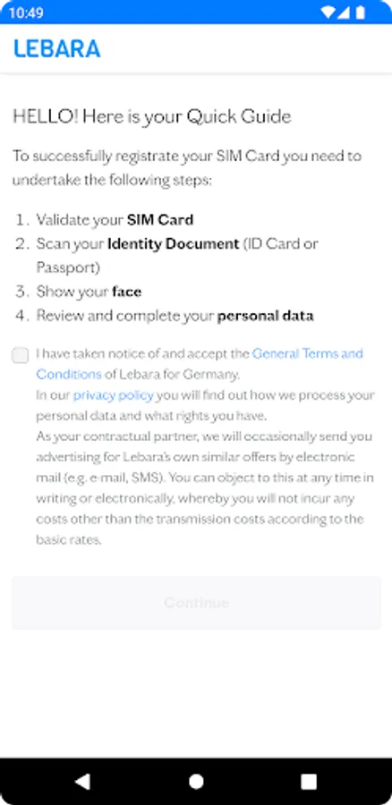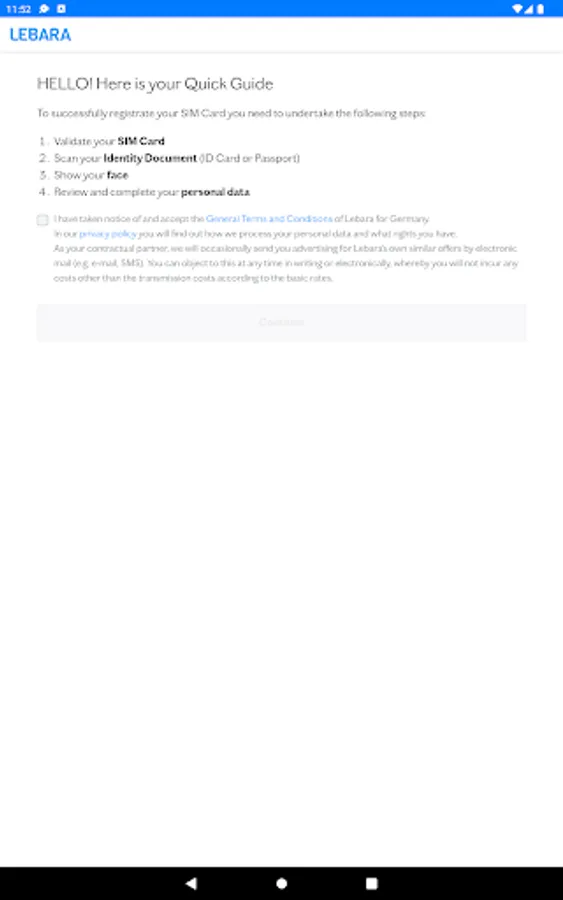 The Lebara SIM Activation is the easiest and fastest way to register your Lebara SIM card. You've downloaded the app and have your identity document and Lebara card ready? Then you can register your card in just 3 minutes!