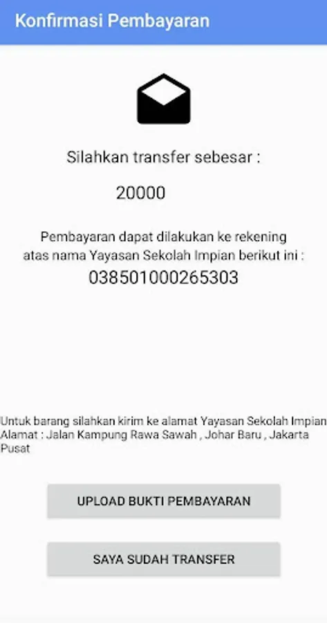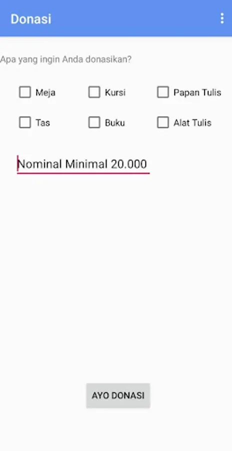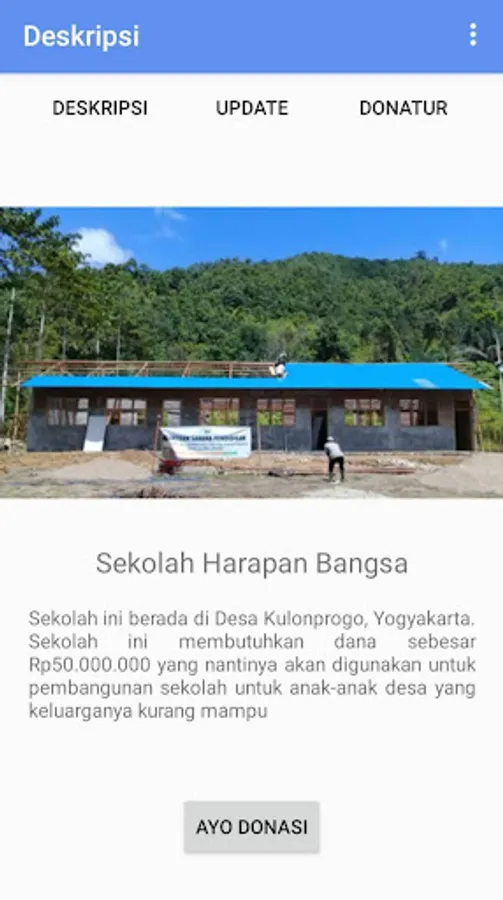 Pada aplikasi ini nantinya Anda dapat berdonasi baik berupa uang maupun barang keperluan sarana/prasarana sekolah. Setelah Anda berdonasi, Anda dapat mengetahui perkembangan pembangunan sekolah dari dana yang sudah Anda donasikan.