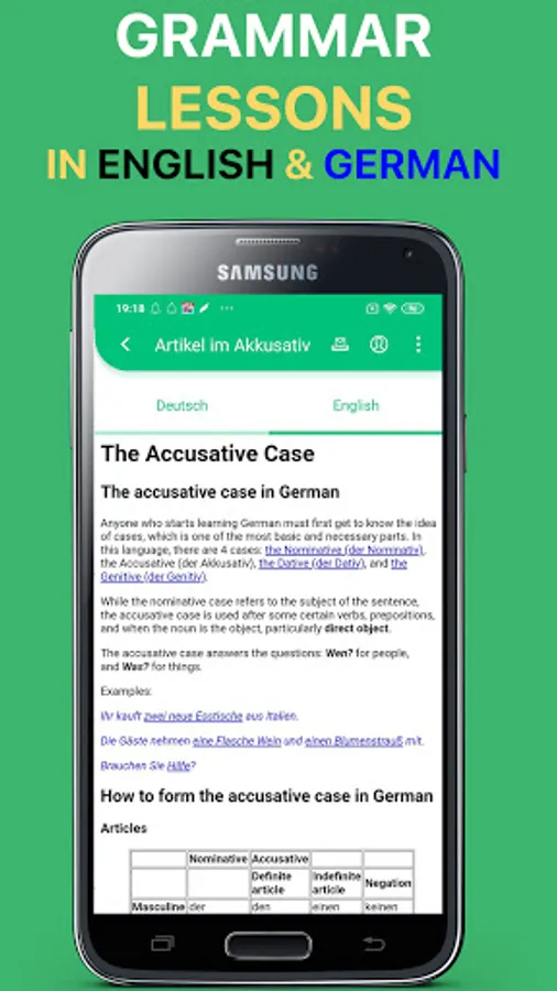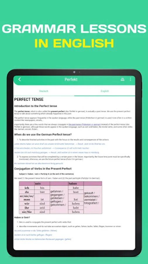 - All important German grammar topics are covered in this learning language application: tense (past, present and future), German articles (der, die, das and no articles), verbs, irregular verbs, verb conjugation, passive,... This application is good for learners on both beginner (A1 and A2 level) and intermediate levels (B1 and B2 level).
