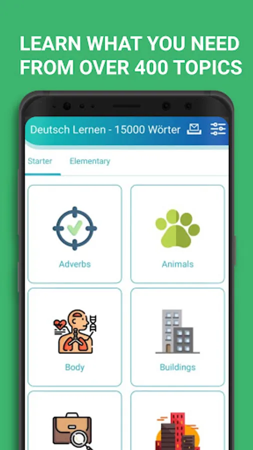 â–ş 15.000+ German words (and still contantly growing): the most common nouns with articles, verbs, adjectives, etc., in the German language categorized into over 400 topics;
