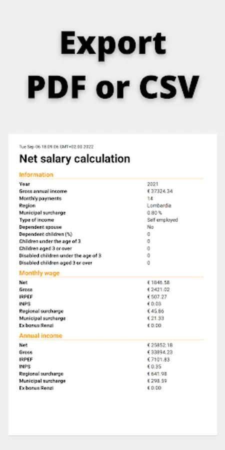 After calculating the monthly and annual net salary, you can export this data in PDF and CSV format. In this way they can be shared with your partner or stored in paper format.