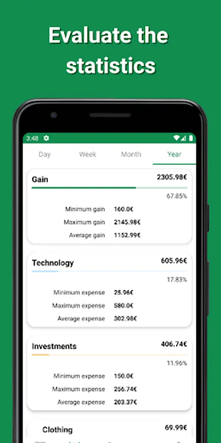 - Track transactions by day, week, month and year. Find out your minimum, average, maximum expense or earnings.