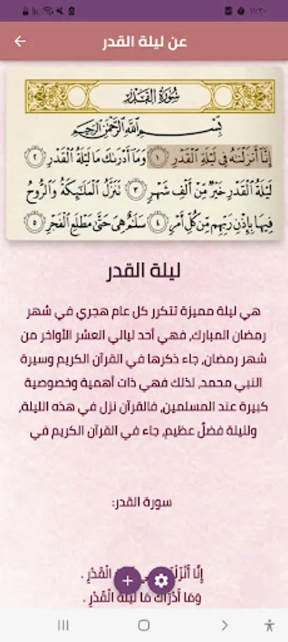 إِنَّا أَنْزَلْنَاهُ فِي لَيْلَةِ الْقَدْرِ (1) وَمَا أَدْرَاكَ مَا لَيْلَةُ الْقَدْرِ (2) لَيْلَةُ الْقَدْرِ خَيْرٌ مِنْ أَلْفِ شَهْرٍ (3) تَنَزَّلُ الْمَلَائِكَةُ وَالرُّوحُ فِيهَا بِإِذْنِ رَبِّهِمْ مِنْ كُلِّ أَمْرٍ (4) سَلَامٌ هِيَ حَتَّى مَطْلَعِ الْفَجْرِ (5)