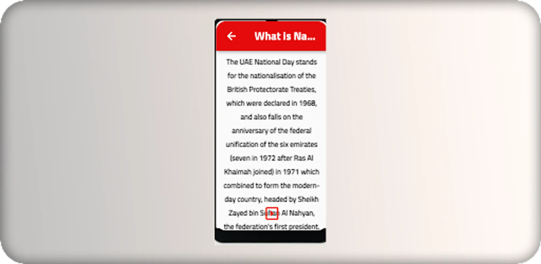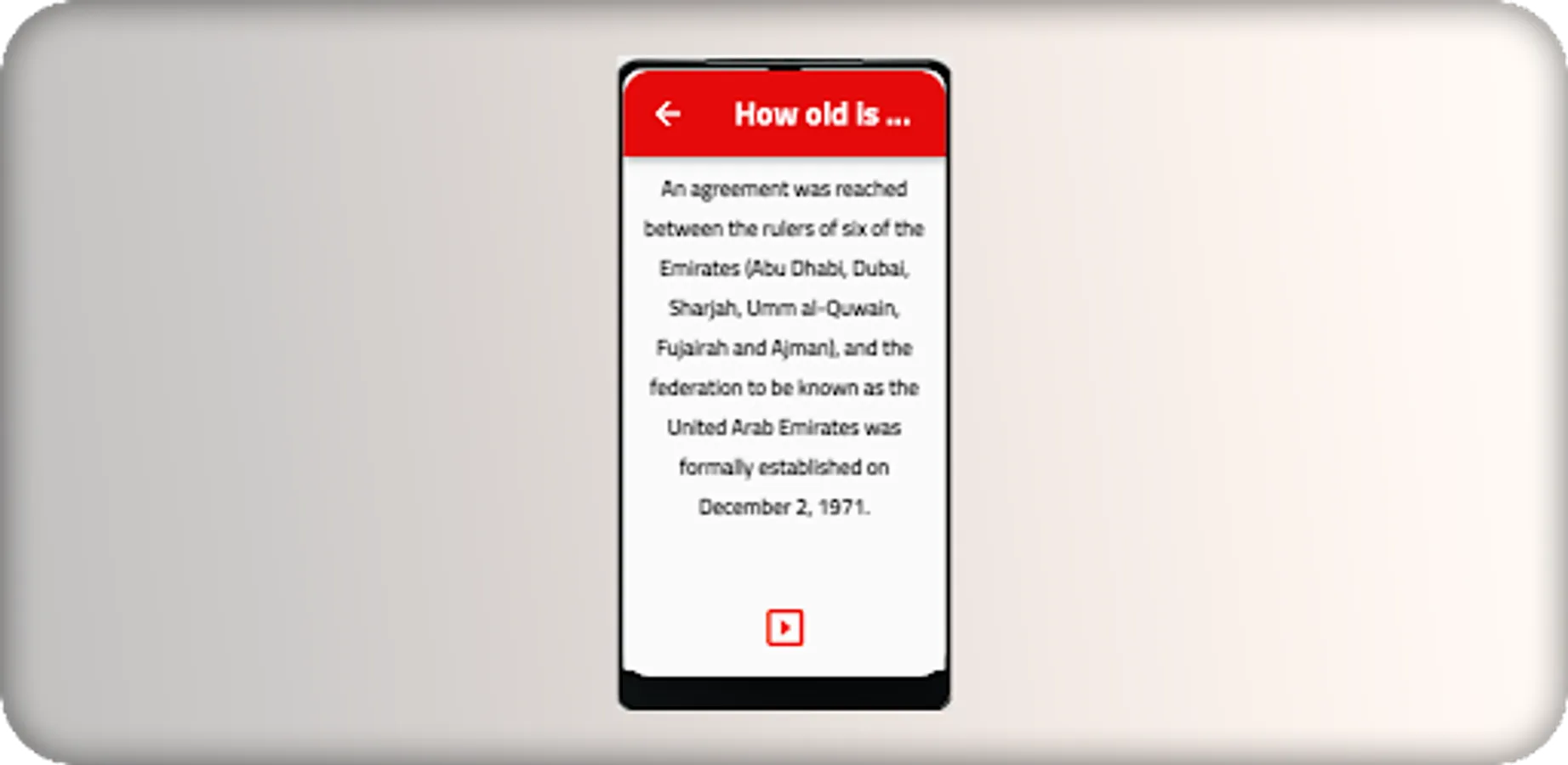 تطبيق اليوم الوطني الاماراتي يعرف المستخدم كل ما يربد معرفته عن هذا اليوم وموعده واهميته بالنسبة للامارات والشعب الاماراتي ,ويقدم للمستخدم اماكن قضاء عطلة اليوم الوطني الاماراتي وطريقة احتفال الشعب الاماراتي بهذا اليوم الجميل ويكون معوده يوم الجمعة 2/12