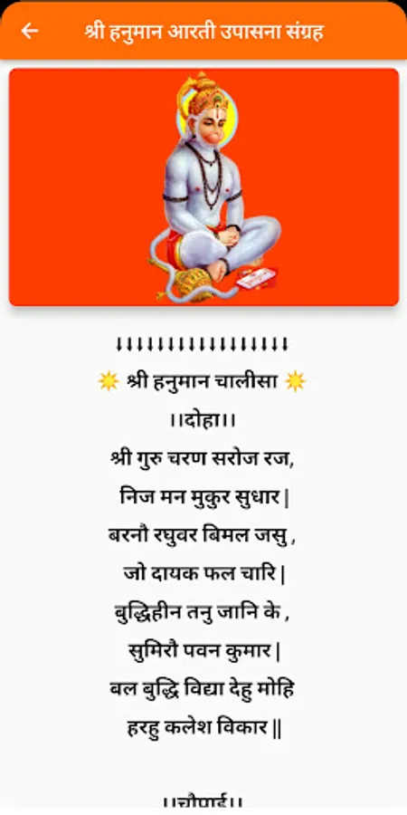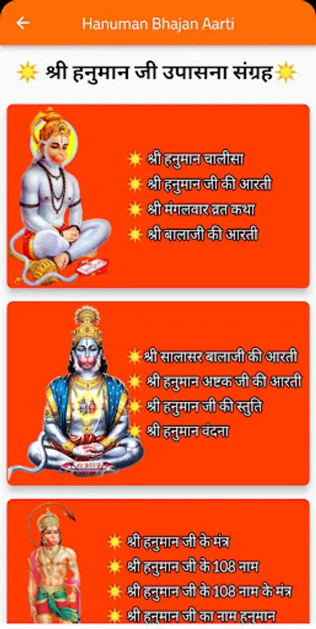 App also has a lot of devotional topics such as हनुमान जी के 108 नाम के मंत्र Ram bhakt hanuman ki gaatha हनुमान जी के विवाह का रहस्य Hanuman katha and stories such as बाल हनुमान ने ऐसा क्या किया कि उनका नाम हनुमान रख दिया गया or हनुमान क्यों हुए सिंदूरी and जब कुंवारे श्री हनुमान जी को लड़ना पड़ा अपने ही पुत्र से or जब श्री हनुमान जी के कोप से बचने के लिए शनि देव को बनना पड़ा स्त्री and ये वो काम हैं जो केवल कर सकते थे श्री हनुमान etc.
