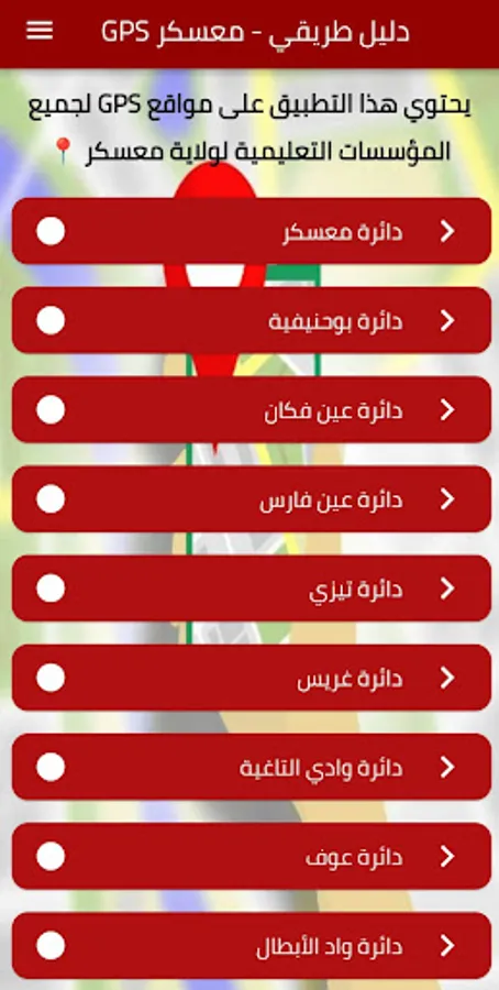 يحتوي هذا التطبيق على كل مواقع GPS روابط مباشرة على الخريطة Maps لجميع المؤسسات التعليمية من اكماليات و ثانويات لولاية معسكر و ضواحيها الدوائر و البلديات و ذلك لتسهيل امكانية الوصول اليها بطريقة مبسطة و سهلة بضغطة زر واحدة,