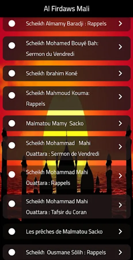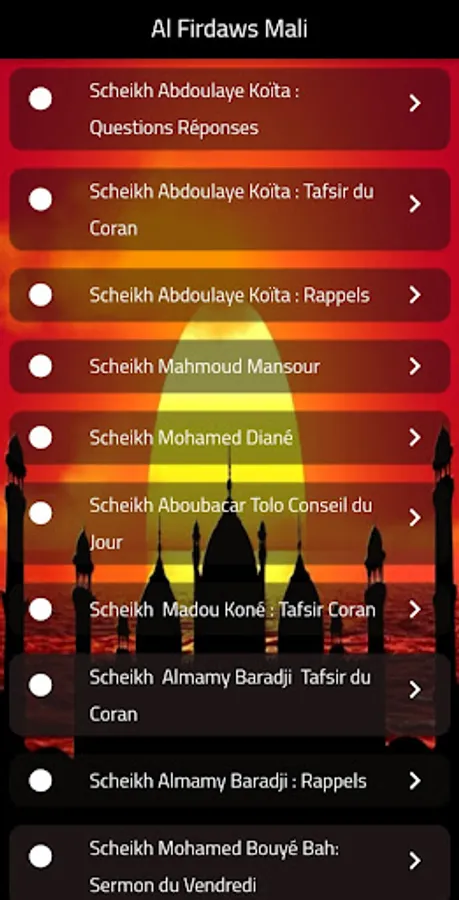 Al Firdaws Mali brings together several Scheikh of Mali, who are Abdoulaye Koïta, Scheikh Mohamad Mahi Ouattara, Scheikh Ibrahim Koné, Scheikh Mahamoud Mansour, Scheikh Aboubacar Tolo, Scheikh Almamy Baradji, Scheikh Mohammad Diané, Scheikh Mahmoud Kouma, Scheikh Mohamad Bouyé Bah, Malmatou Mamy Sacco.