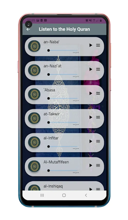 The thirtieth part of the Holy Quran app contains Juz Amma (Last chapter of the Holy Quran) and Surat Al-Fatiha.
