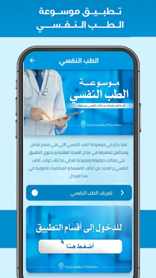 The "Psychiatry - The Comprehensive Encyclopedia" application is a comprehensive and integrated platform dedicated to providing content and information related to mental health and mental illness. The application provides a variety of features that help individuals in understanding and addressing psychological issues comprehensively and effectively. Here is a description of some of the main sections and features of the app: