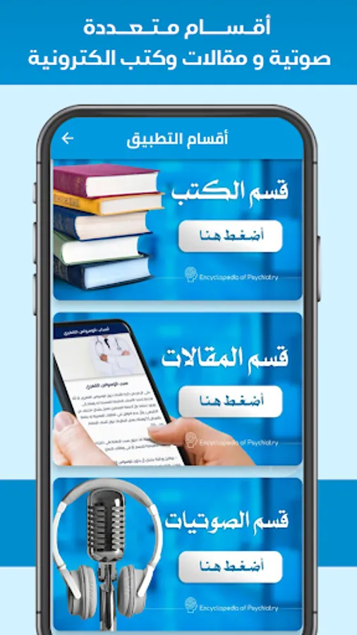 In short, the "Psychiatry - The Comprehensive Encyclopedia" application is an outstanding source of information and resources in the field of mental health, as it offers a rich and varied content of books, audio lectures, pre-recorded consultations, and useful articles, helping individuals understand their mental illnesses and learn how to deal with them. and work to prevent it.