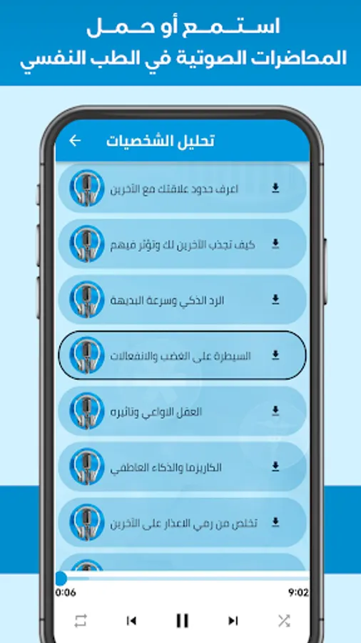 This section provides a set of audio lectures covering various topics in psychiatry. Users can listen to these lectures on the go or while performing other tasks. Users can download audio files from lectures and consultations to listen to them at a later time without the need for an internet connection