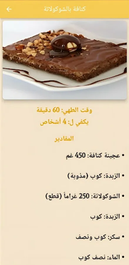 The Delicious Kunafa application includes clear details for each step in the Kunafa preparation process, from choosing the right ingredients to the final steps to serving the Kunafa in a delicious and impressive way. The app also allows for customizing recipes according to user preferences, such as adjusting ingredient amounts or adding additional ingredients.